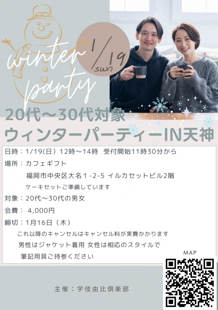 2024年12月16日 / 最終更新日時 : 2025年2月6日 kitahara2021 婚活・パーテイー 婚活イベント「20代~30代対象」ウインターパーテイーIN天神 福岡婚活イベント「20代~30代」体験参加募集中! お問い合わせ: ハピネス北原結婚相談室 携帯:090-1341-0520 https://www.hp-ns.net/ 北九州の結婚相談所ハピネス北原 この人に出会って本当に良かった。 その言葉のために https://www.hp-kt.net Follow me! FacebookBlueskyCopy コメントを残す コメントをキャンセルメールアドレスが公開されることはありません。 ※ が付いている欄は必須項目ですコメント ※ 名前 ※ メール ※ サイト 次回のコメントで使用するためブラウザーに自分の名前、メールアドレス、サイトを保存する。